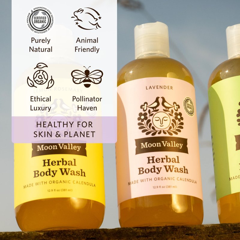SOFTENING AND MOISTURIZING MADE WITH ORGANIC CALENDULA POLLINATOR FRIENDLY NON-GMO VEGAN GLUTEN FREE LET’S RECYCLE Our Herbal Body Wash combines Moon Valley Organics’ farm grown herbs, with pure essential oils to gently cleanse, soften, and moisturize your entire body.