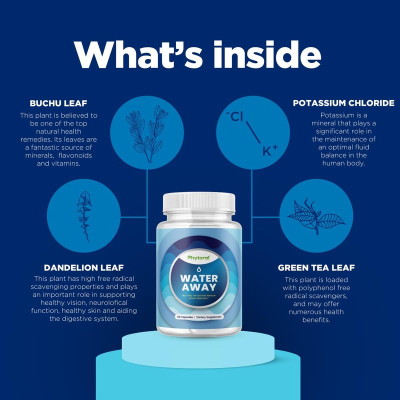 The leading name in herbal supplements, Phytoral proudly presents our premium water away pills. Using high-grade natural ingredients to provide you and your body the best possible supplement we can. Our Water Away pills are a great way to help your body find balance for both water and sodium levels. Our scientifically optimized formula has potassium, vitamin B6, chloride, dandelion, and more to help you feel your best. Try our water pills and experience the Phytoral difference.