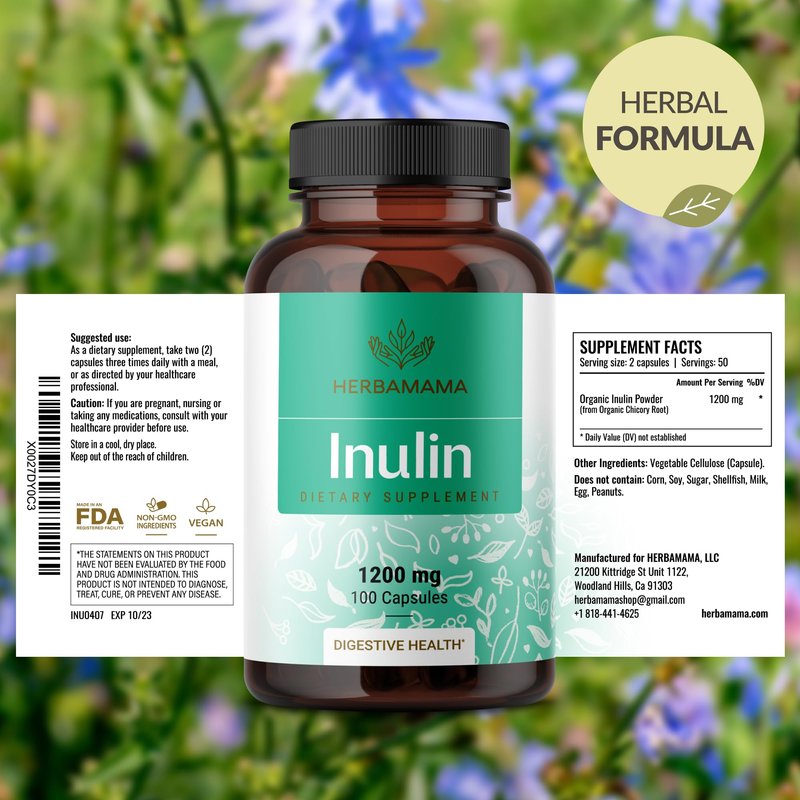 - Digestive Health: Herbamama's Inulin capsules are crafted to support your gut health. Chicory root powder is a source of inulin prebiotic fiber, ensuring digestive support.