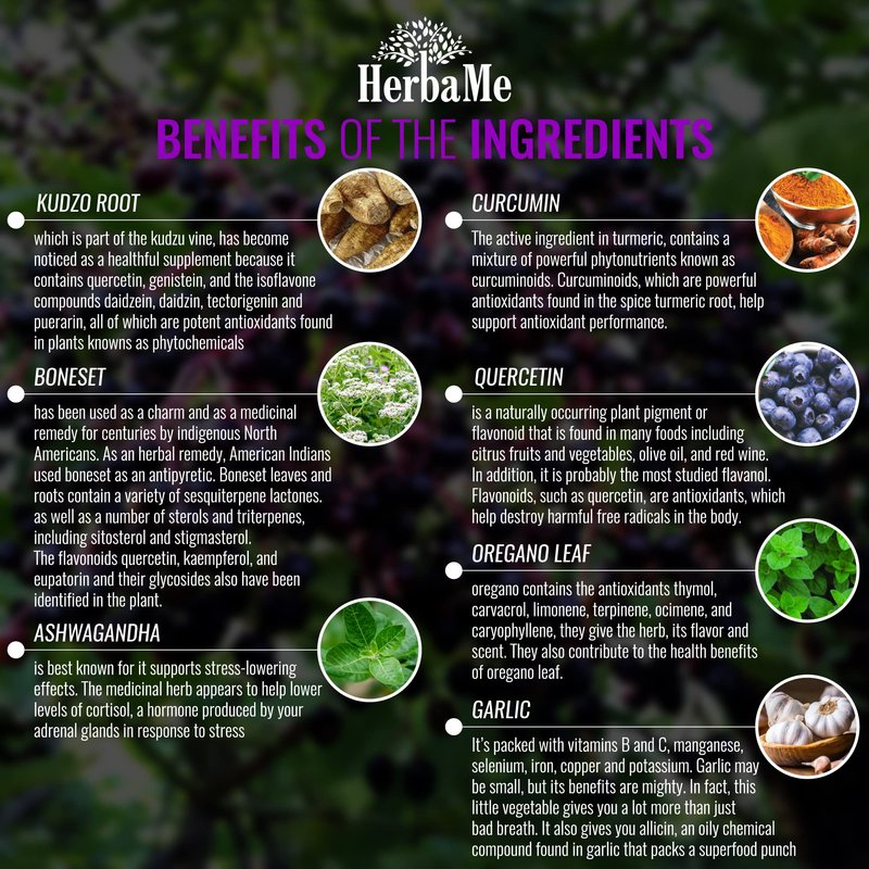 Protect and fortify your immune system with an advanced wellness blend that’s packed with antioxidants, vitamins, and natural defense-boosting ingredients. More than ever it's vital that you keep your immune system strong! HerbaMe Immune Keeper was developed to help you maintain a healthy immune system with natural vitamins, antioxidants, and other key minerals. A smarter, more effective daily supplement for both men and women our formula can help strengthen teeth, bones, muscles, joints, and even your immune system, so you can be at your best no matter the weather or conditions out in the world. Key Benefits: Helps Fortify Immune System Health Immune System Support Supplement Promotes Overall Wellness 15 in 1 Formula: Rich in Antioxidants, Vitamin C, Zinc, and Elderberry Vitamin D and Magnesium Olive Leaf, Andrographis, Kudzu Root Boneset, Garlic, Turmeric, Oregano Leaf Quercetin Product Details: No Artificial Flavors or Additives Crafted in a GMP-Certified Facility Formulated in the USA Bottle Volume: 90 Vegetarian Capsules Keep your immune system health strong all-year-round by supporting your immune defense with HerbaMe and be better prepared every day. Get a bottle now by clicking Add to Cart above and take an active approach to your health. If for any reason, you don’t feel satisfied with our Immune Keeper supplement, simply send us back the jars, even if they’re completely empty, and we’ll refund you every single cent. No hassles, no questions asked.