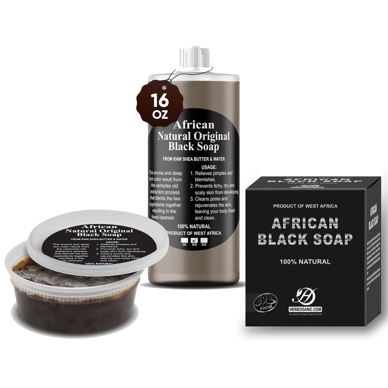 HERBOGANIC African Black Soap Liquid, Paste & Soap Bar,100% Raw Pure Natural From Ghana Face & Body Wash Supports Moisturizing,Dry Skin, Scars and Dark Spots (16 Oz Each)