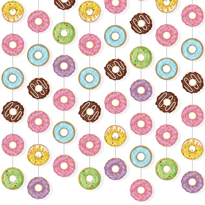 - Suitable Size: the length of each donuts hanging swirl is about 39.4 inch while the distance between each donut pattern is about 2.3 to 2.7 inch; The size of doughnut paper cutouts on the party banners is about 4 x 4 inch