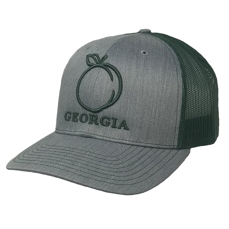 Show your home state pride that you have with this raised 3-D embroidered Georgia Peach hat. This peach state Embroidered Cotton/Nylon/Polyester Trucker Mesh Baseball Cap is a 6-panel structured fit baseball cap features an integrated cotton sweatband, 8 rows stitching across the bill, rear plastic mesh for breathability, pre-curved bill and comes with an adjustable plastic snap closure; this stylish relaxed cap will be on your list of favorite caps to wear. The 3-d embroidery on this cap features the text GEORGIA and a peach across the front of the hat. This hat is perfect for relaxing weekends on the beach, hiking trips in the mountains, barbecues in the back-yard or day-to-day errands around your hometown. Keep your eyes shielded from the sun's rays while looking fly and showing off your State pride. All hats are either imported Pacific Headwear or Richardson caps. One Size Fits All with an Adjustable Snap-back Strap. 47% Cotton/ 28% Nylon/ 25% Polyester