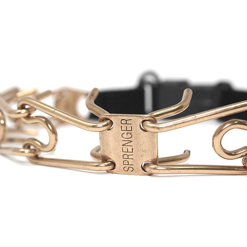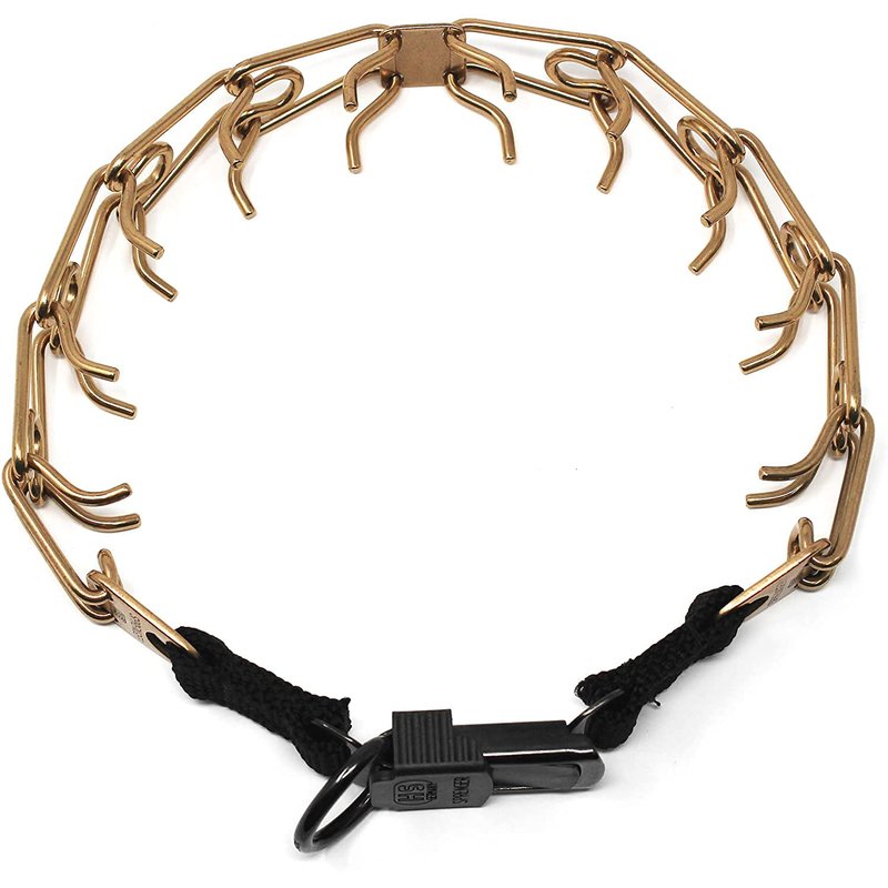 The Herm Sprenger Curogan Training Collar with ClicLock quick release buckle is one of the most recognizable and popular names in obedience training tools. A safe and effective alternative to other training collars, it puts even pressure around the neck, about every half inch, pushing the skin in a band. This collar does not apply direct pressure to the trachea, so you can train your dog with little or no tugging, jerking, or pulling. The addition of a center plate connector allows the middle link to be configured symmetrically, enabling the links to tighten in the same direction. Made of high-quality Curogan (Copper and Tin allow). Curogan is completely Nickel free, which makes it a perfect choice for dogs who are allergic to nickel. The size of this collar can be adjusted by adding or removing the links individually. Features: interlocking links, each link equipped with two blunt links slips over the dog's head for easy on, easy off slightly beveled rounded link tips easy to increase or decrease in size. Additional links are sold separately. Sizing instructions: collar should fit snuggly just below the dog's ears, measure the circumference of the dog's neck and add 3 inches.