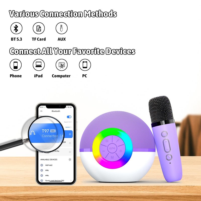 - Bluetooth 5.3:This karaoke machine makes getting the party started a breeze! The speaker and wireless microphone automatically pair when you switch them on - no complicated setup is needed. Just grab the mic and start singing. To connect your phone or computer, turn on the karaoke microphone's Bluetooth and select "T97" on your device. With the latest Bluetooth 5.3 technology, you can enjoy seamless streaming and a rock-solid connection up to 30 feet away