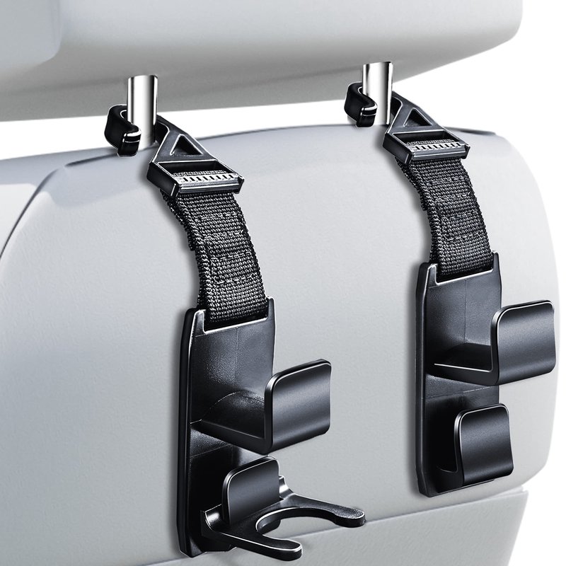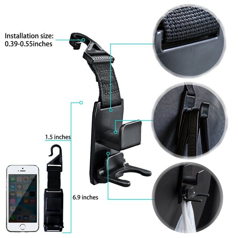 - STURDY AND DURABLE: This HEAVY DUTY headrest hooks are well made of EXCELLENT QUALITY material. They are very sturdy for your heavy purse or groceries and designs allow HANG MORE and more stuff than others. And the nylon fabric strap makes them more durable than all plastic ones, they are magic headrest hooks for car.