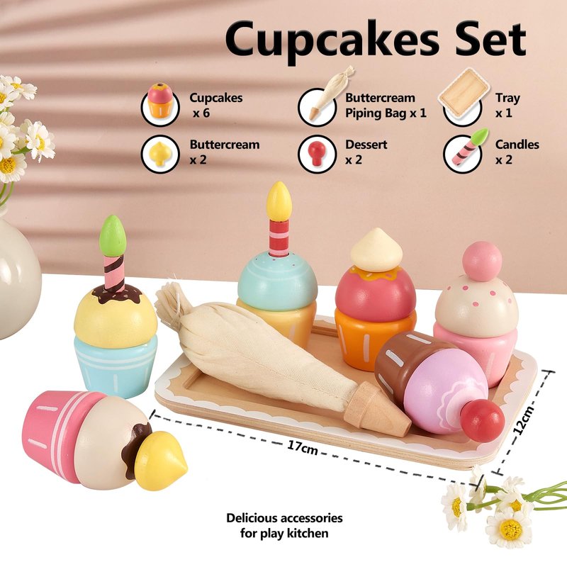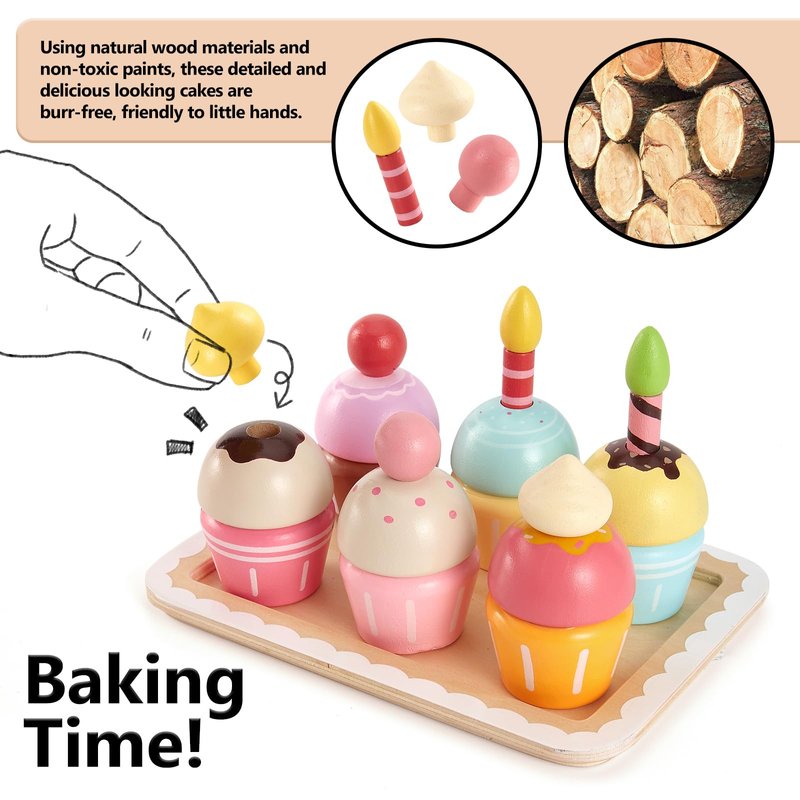 - Kid's sweet time! Realistic play food. The shape mimics the actual appearance of the dessert, giving children a more realistic experience. Made of wooden material, smooth edges, sturdy and durable