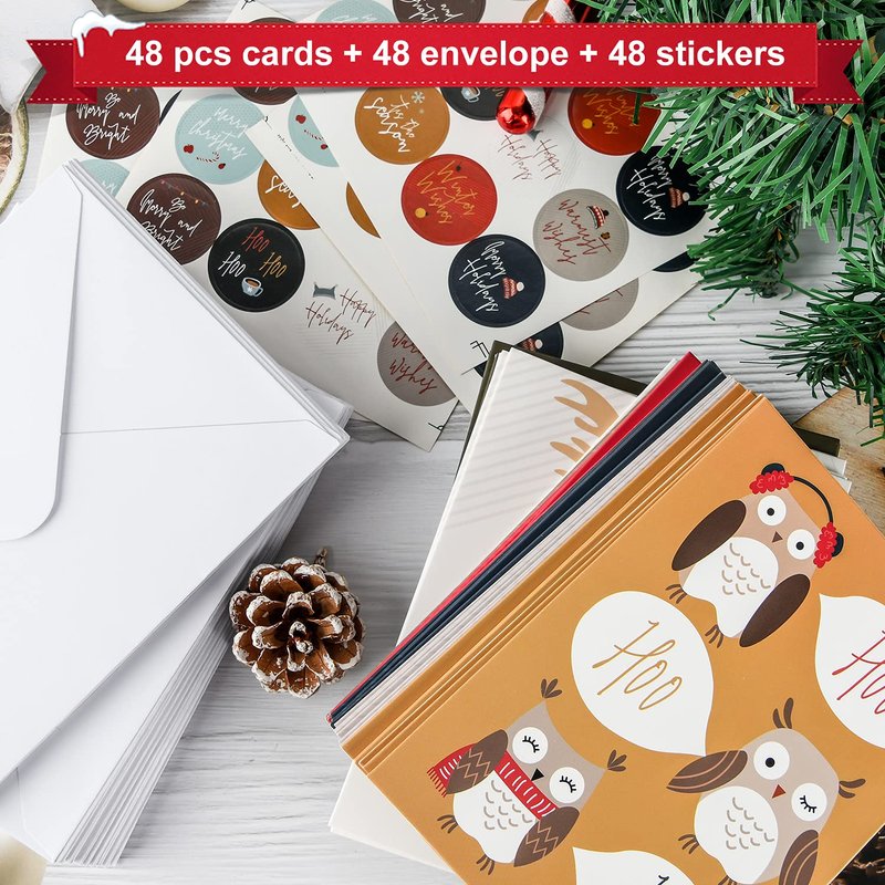 HERZOME 48 Pack Christmas Winter Holiday Greeting Cards With Envelopes and Stickers, 8 Pattern Woodland Animals Holiday Xmas Cards