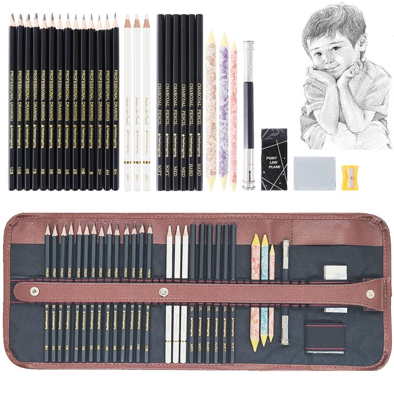 - 【Complete Pro Art Drawing Supplies Pencils kit】14pcs drawing pencils (from 6H to 12B), 6 charcoal pencils (2*soft, 2*medium, 2*hard), 3 oil white colored pencils, 3 blending stumps (size: S, M, L), 1 kneaded eraser, 1 hard eraser, 1 pencil extender(or say pencil life extender) and 1 canvas roll up pencil bag.