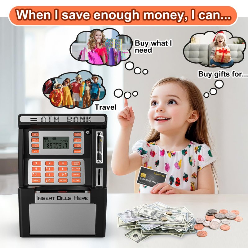 - Debit Card + 4 digit Code to Access - Just insert the debit card and enter 4-digit PIN,the LCD screen lights up and makes voice prompt. A fun educational toy of money savings for kids, it's perfect for Christmas gifts or birthday present.