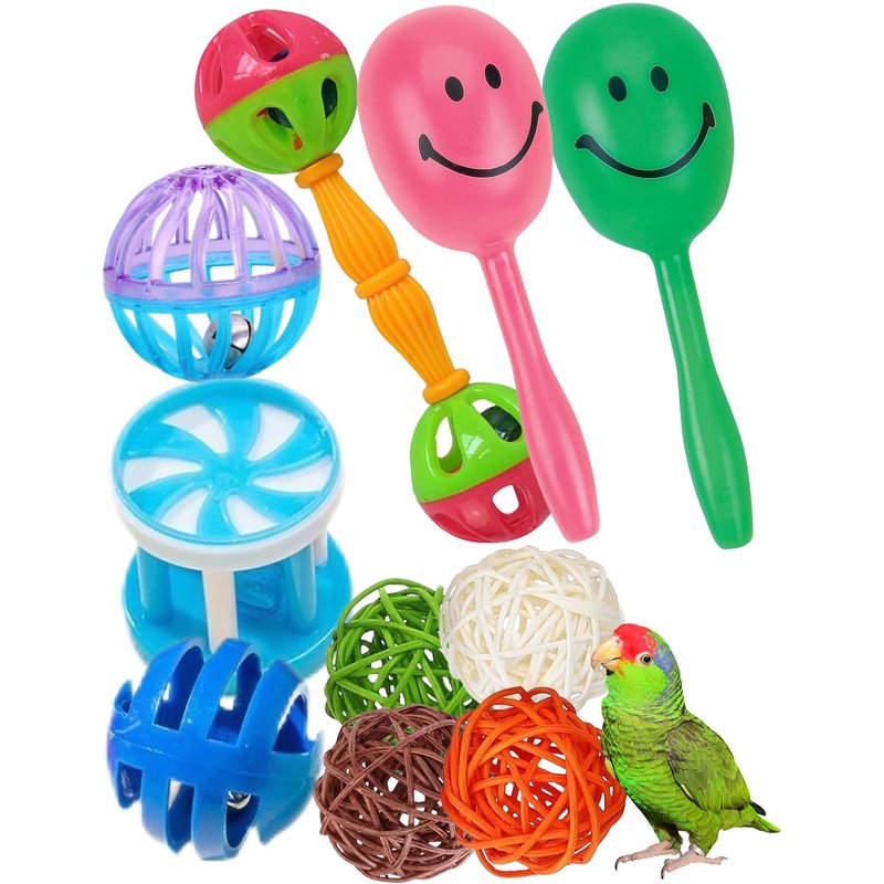 - The bird toy pack includes 10 toys: 5 different types of bird toys, 4 tree vine balls in different colors, 2 bottle-shaped toys with sounds inside and in different colors, 3 other kinds of toy balls, and 1 toy that has balls on each end.