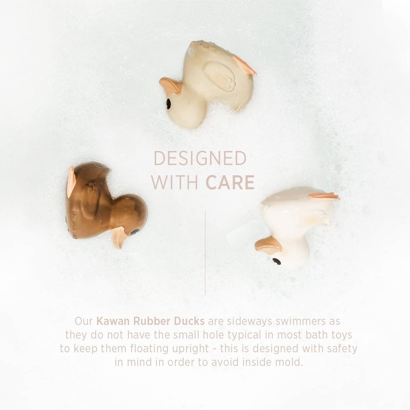 Scandinavian designed, our Kawan Rubber Ducks are not only beautiful and companions in play, but most importantly, they are naturally safe bath toys for your little one! Made from 100% natural rubber, our Kawan Rubber Ducks are plant-based and vegan certified, and our approved color pigments are also natural. Importantly, we design our bath toys to avoid inside mold and to easily be kept clean, so our Kawan Ducks have a one-piece design with no holes.