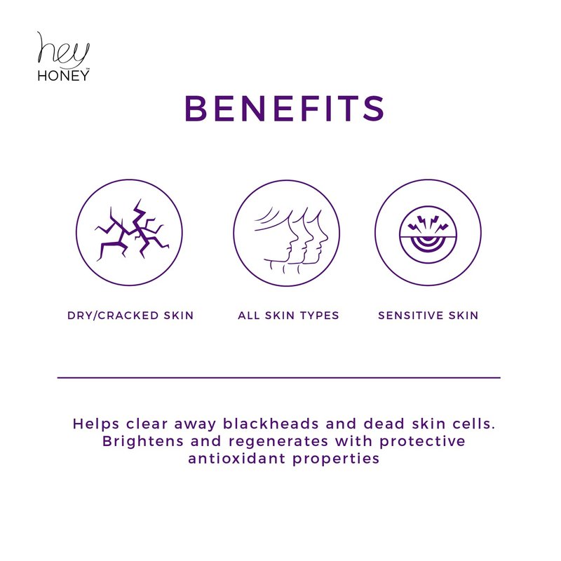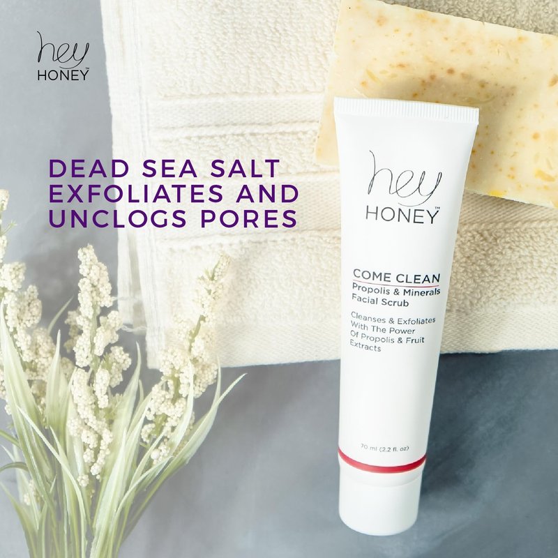 Hey Honey, Come Clean Propolis & Mineral Facial Scrub. Rich, Exfoliating, Dead Sea Salt Scrub designed to be gentle enough for even the most sensitive skin. 110ml
