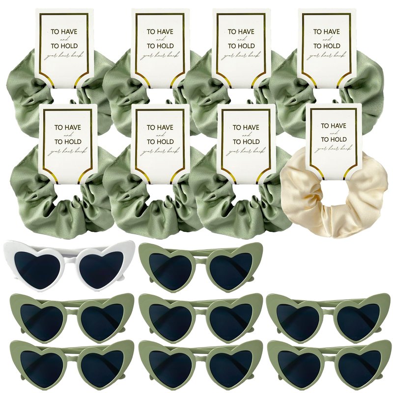 - Bridesmaids Favor Set: the package includes 8 pcs hair Scrunchies and 8 pcs sunglasses gifts for the bridesmaid. 1pcs for you and 7 pcs for your friend, Perfect as bachelorette party favors and bridesmaid gifts!