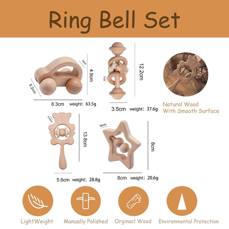 HI BABY MONMENT Wooden Baby Toys Set, Wooden Rattle Set,4PC Handmade Wood Toys,Baby Wooden Toys 36+ Months,Montessori Toys with Wood Car Baby Rattles,for Boys and Girls