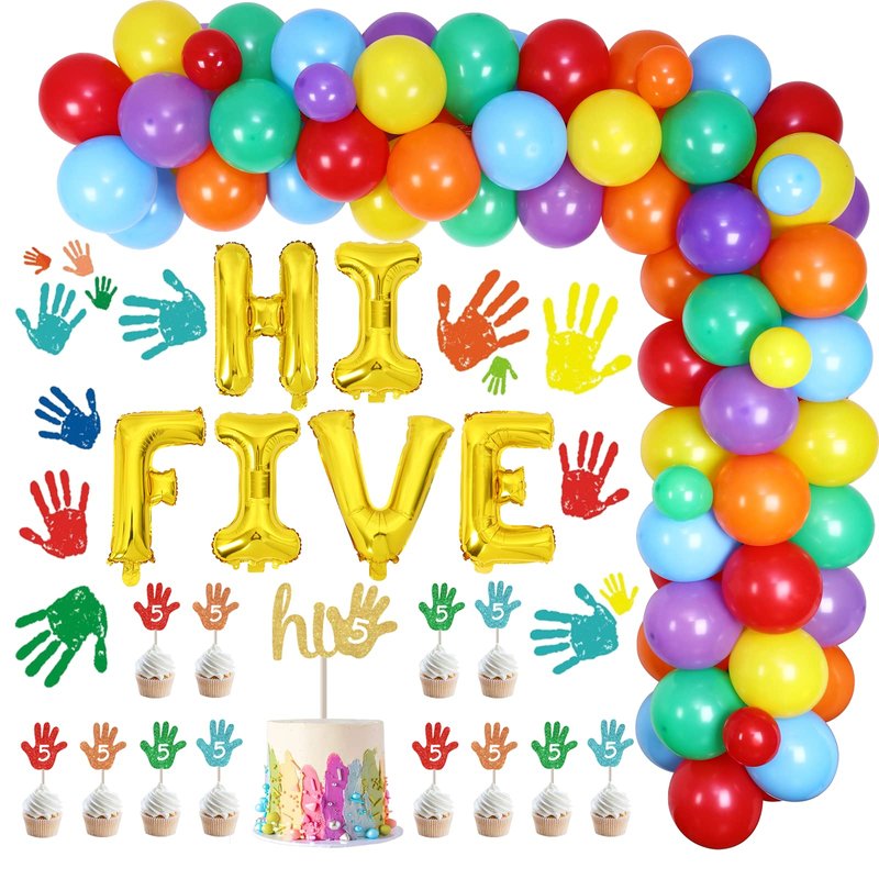 - [Unique Design]: Hi Five 5th birthday party supplies perfect for little kids boy girl cheers to 5 years old birthday, colorful latex balloons garland with HI FIVE foil balloon banner, handprint sticker brings joyful and meanings, handprint 5 glitter cake topper and cupcake topper special design for 5th birthday