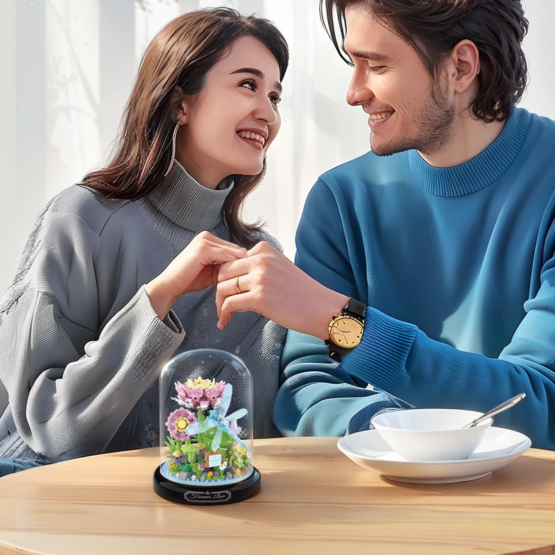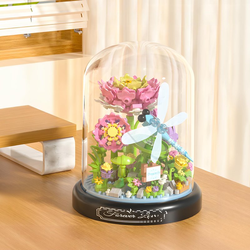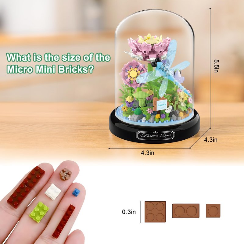 - Design: The Forever Flower Building Blocks Set vividly features dragonfly fluttering among flowers, complete with a display base plate and dust cover