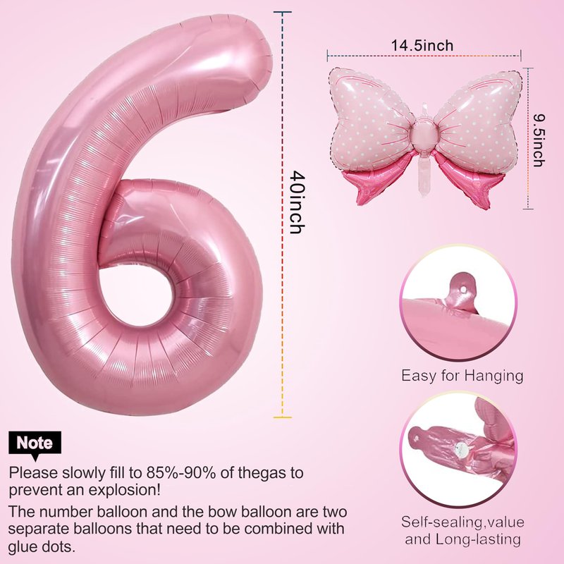 HIBILDER 2PCS Pink Number 6 & Mini Bow Balloon, 40in Birthday Party Decorations, Girls 6th Party Supplies, Safe Aluminum Foil Material