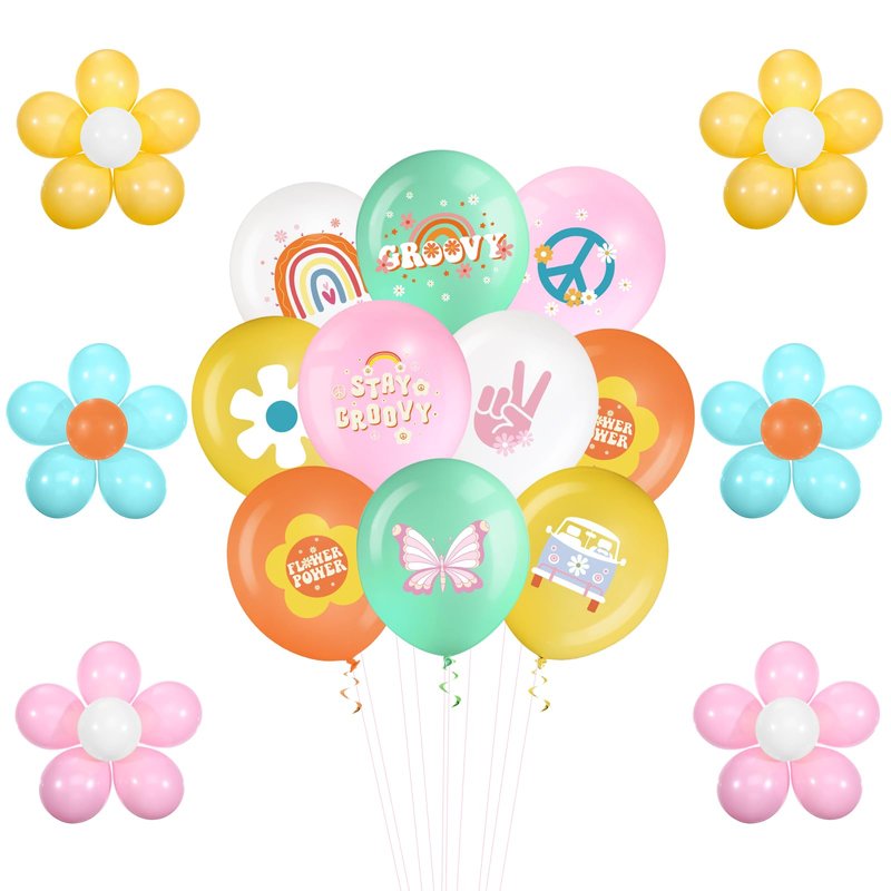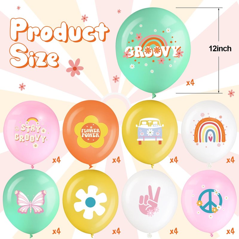 - Retro Hippie Themed Balloons: set of 72 groovy party balloons with distinctive retro hippie patterns and designs
