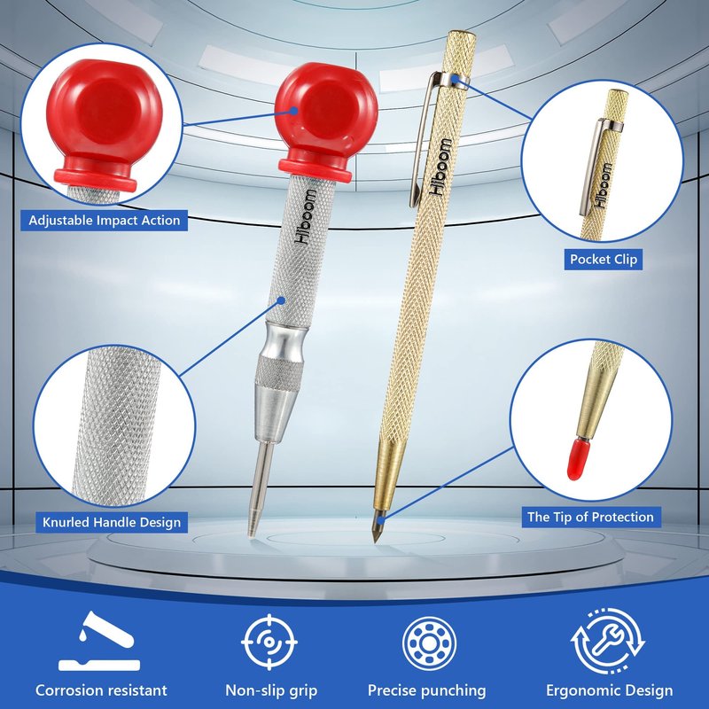 - Practical Center Punch Tool: the automatic center punch is made of chrome plated steel body, have high impact resistance and wear resistance; The red cap on the top can give you a good grip while you apply pressure, unscrewing it can adjust the force of impact; A deep knurled finger grip for easy handling and better control with one hand; Makes center punching a breeze; This center metal punch is good for wood, plastic, metal, glass, and leather