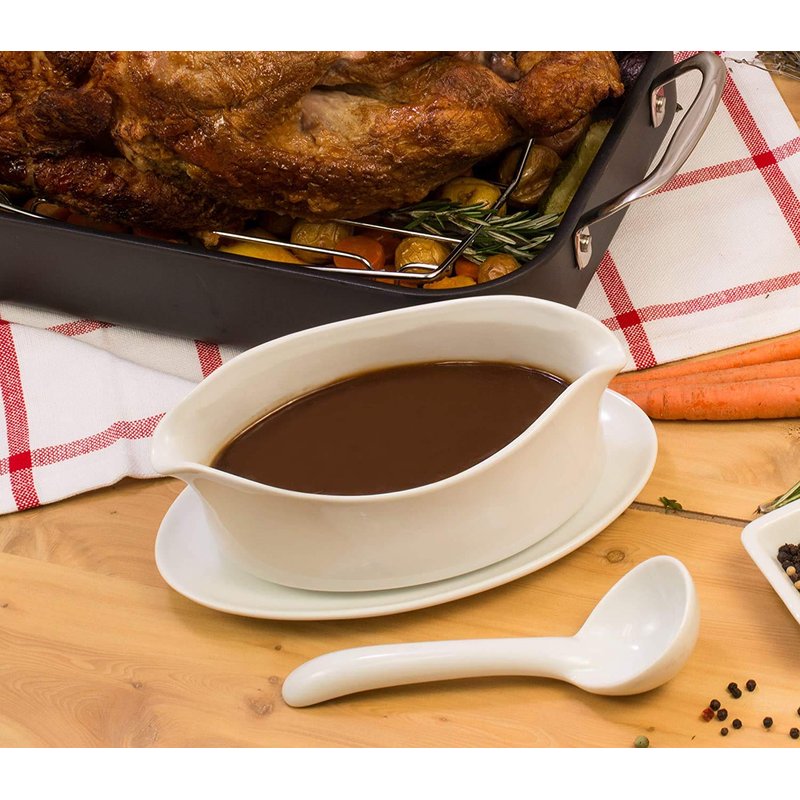 - HIC Kitchen’s Fine Porcelain Gravy Ladle for serving gravy and saucing appetizers, salads, entrees, sides and desserts