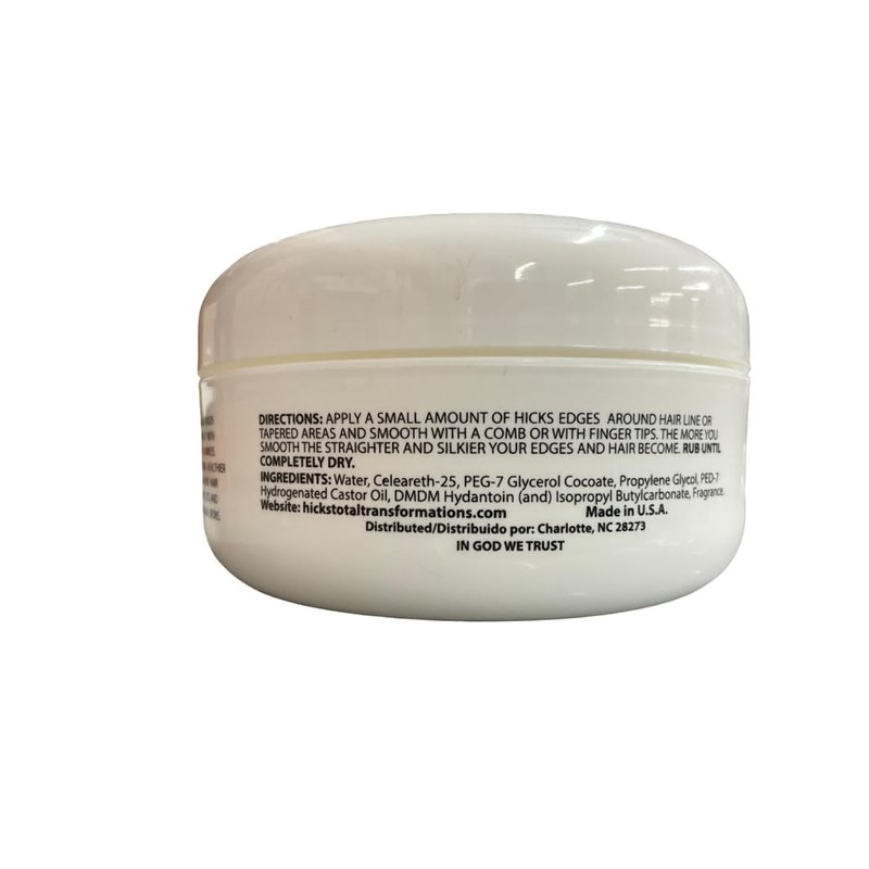 - Hicks Edges Pomade firmly smooths the hair and edges with added shine.