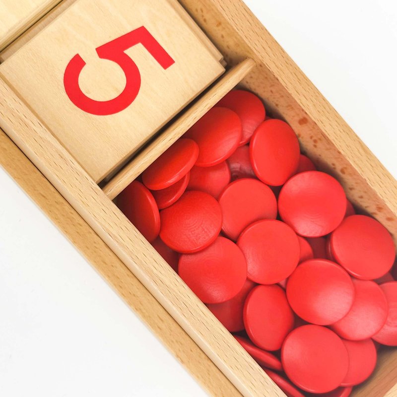 - 1. Consists of 10 number cards(1-10), and 55 red round counters, kept in a separate compartment in the box. Help children associate quantities with numbers.