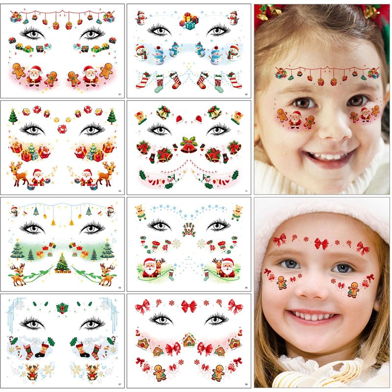 HIFANMM 8Pcs Christmas Fake Tattoos Xmas Cartoon Face Temporary Tattoos Santa Claus Gingerbread Xmas Reindeer Stockings Tattoo Stickers for Adults Kids Eye Makeup Kit for Face Decor Supplies