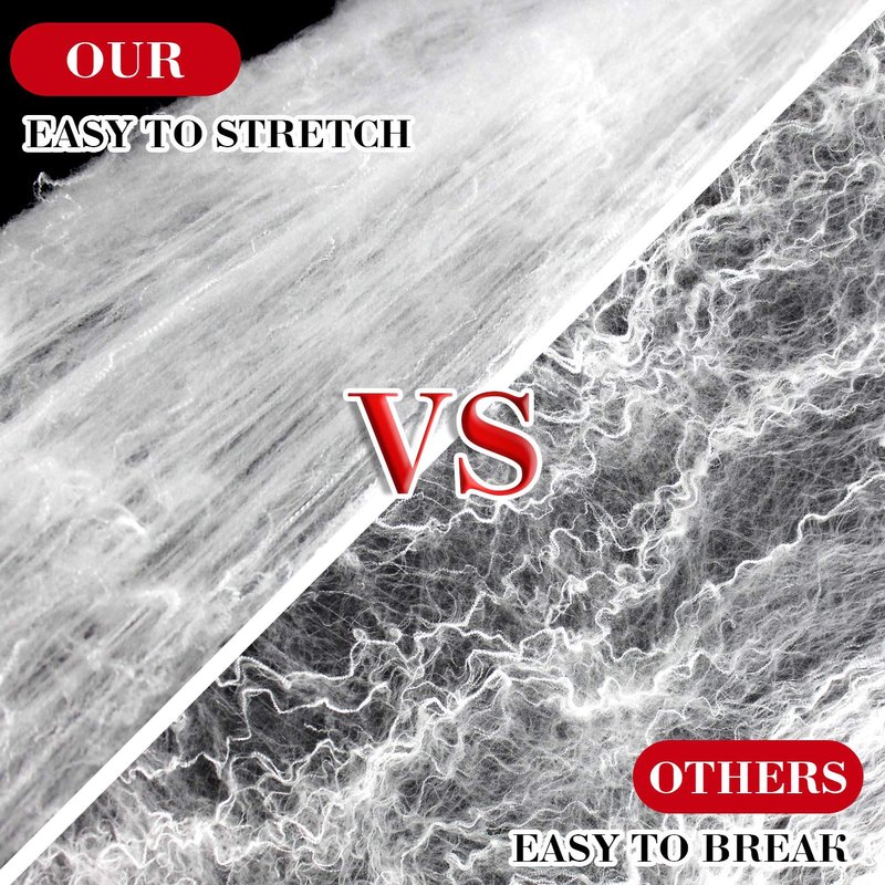 - High-quality Material: Our stretch spider web is made of premium 300 grams of artificial cotton, hand-knotted and durable, easy to stretch and attach on every object anywhere. The fake cobweb can stretch to 1500 square feet of furniture, walls, ceilings, windows, doors, trees and yards.