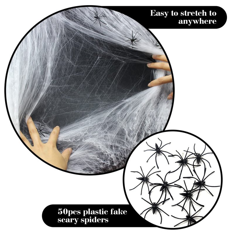 - Package Includes: A pack of 300g super stretch fake web and 50 pcs plastic fake scary spiders to enhance the Halloween atmosphere. The scary spiders are about 2"/5cm which can easily hang on the spider web.