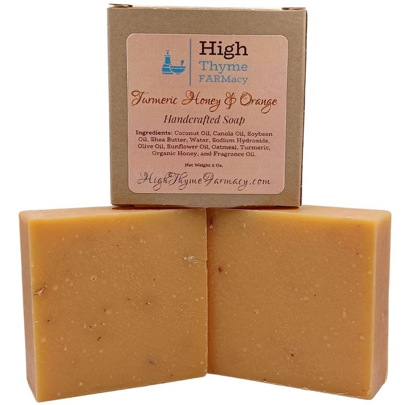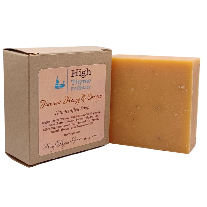 - High Thyme FARMacy's Turmeric Honey & Orange Soap features an aromatic blend of turmeric, honey & orange with a hint of spicy ginger. Our natural bar soap is a perfect addition to your daily routine.