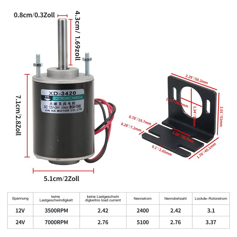 Description Mini permanent magnet DC motor can be connected to 12V or 24V voltage, when connected to 12V voltage motor output speed 3500rpm; when connected to 24V voltage motor output speed 7000rpm; can cw/ccw, external speed governor can realize the speed control function and change the clockwise and counterclockwise direction of the motor output shaft; has the characteristics of high speed and low noise; with motor stand is the DIY generator Ideal choice Motor Parameters Model:3420 threaded shaft head Number of poles:2 poles; Rated power:30w Rated voltage:12V/24(v); Amperage:0.5a Speed regulation:External DC controller is required(purchased by you) to realize the speed regulation. Idle speed:3500/7000(rpm) ) Torque:1kgf.cm(12V), 2kgf.cm(24V). Output shaft length:43mm/1.69inch; Diameter of output shaft:8mm. Specification:12V 3500rpm,24V 7000rpm(motor suitable for 12V-24 voltage). Steering: can be controlled clockwise and counterclockwise(cw/ccw control). Length,width and height of motor mount: 58.2*48.1*51mm Packing List. 1*mini 12V/24V CW/CCW Permanent Magnet DC Motor. 1*Motor Holder 2*M4 Spacer