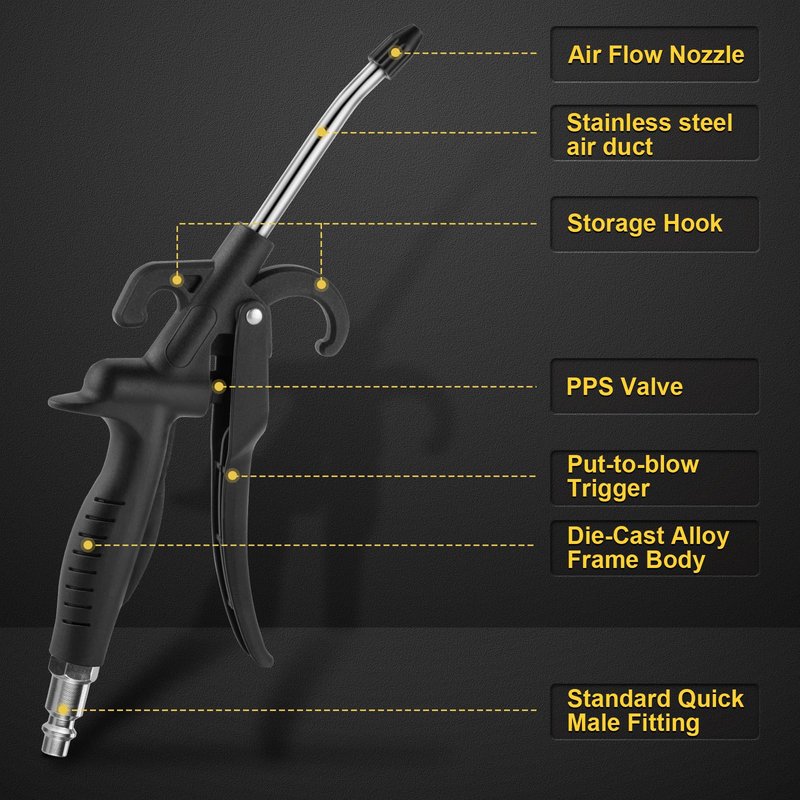 - 【Durable Material】: This air nozzle blow gun adopts premium engineering plastic body and smart trigger, equipped with universal chrome plated 1/4'' NPT inlet thread and metal angled bent nozzle with rubber tip. Overall strong and high hardness, air leaking proof and has a long service life.