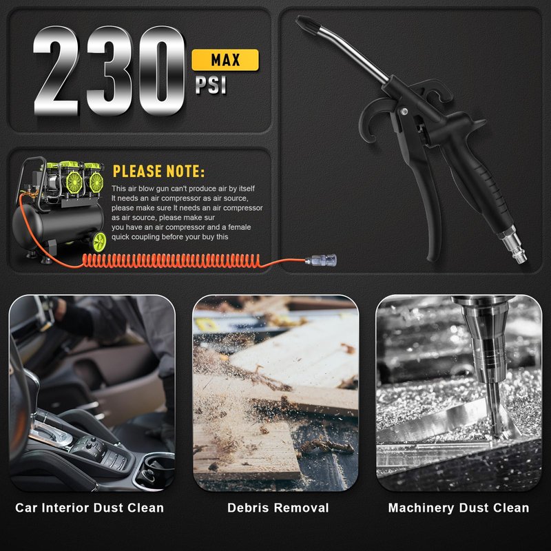 - 【Multi-functional use】: This air blow gun for compressor adopts universal type and version, mainly used for blowing dust, water, powder, debris and various industrial or household cleanup, blow-off operations, car use. Widely used for washing or cleaning places where out of reach.