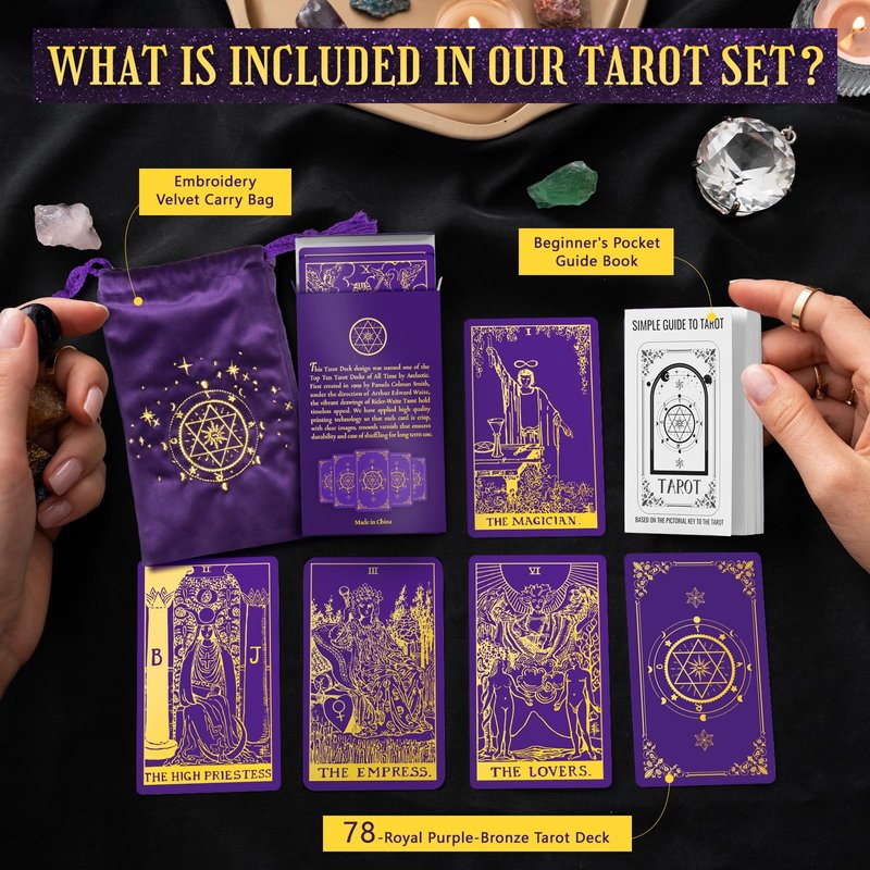 • Card Set: Includes 78 tarot cards, a guidebook, a velvet pouch, and a tarot box