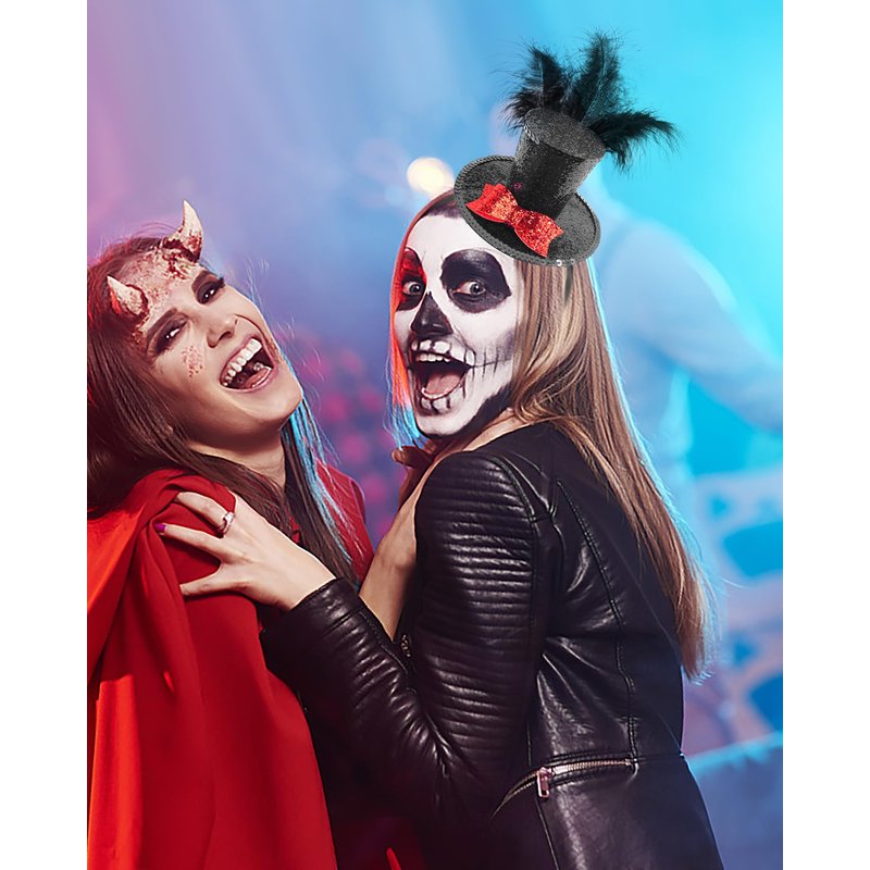 - [Mini Top Hat Style] Multi-colored feathers and a mini top hat on a lightweight headband. Very cute headband decoration, black mini hat, novel bright pink bow design. Brighten up your Halloween party with this shiny, sequined little top hat headband!