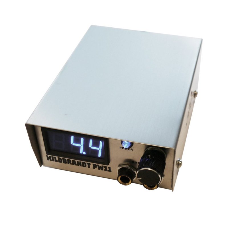 The Hildbrandt Spartan is our standard power supply. Capable of a max output of 2amps. 10 turn dials for precise power adjustments, great for sensitive tattoo machines. Finished in sleek looking brushed stainless steel. The power indicator glows brighter as you turn up the voltage. The power supply is capable of utilizing both North American and European power standards via the flick of the voltage change switch on the back (115V for North America and 230V for Europe). Power supply only, clip cord and footswitch is sold separately. Output: 1.5 – 18V, 2 AMP
