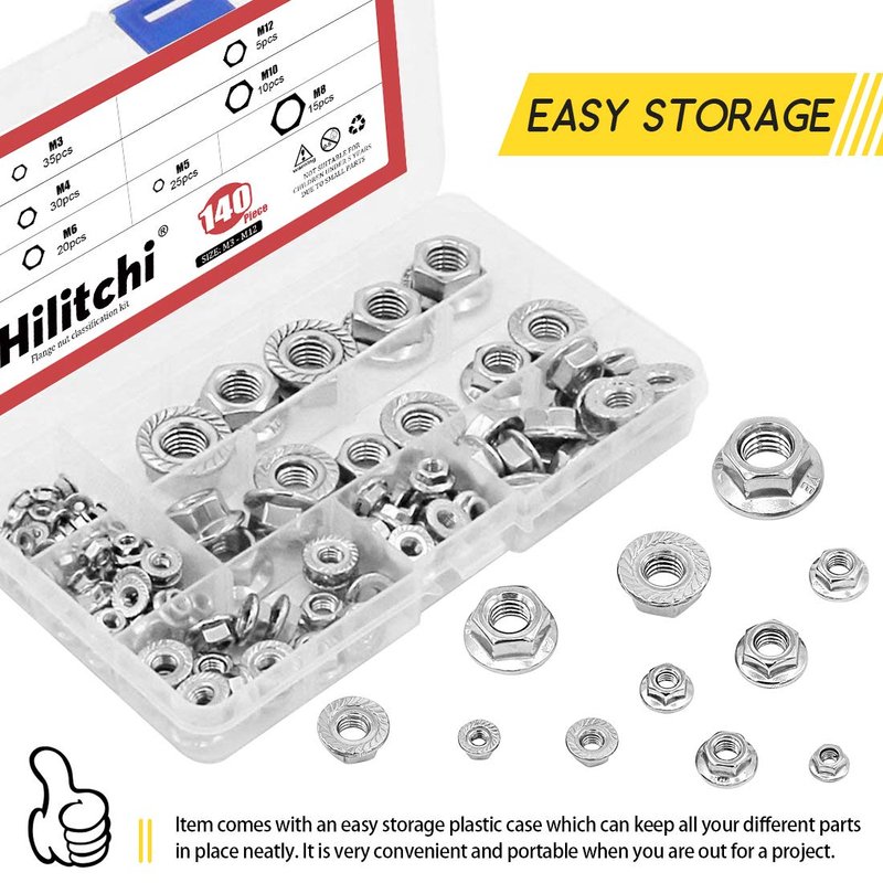 Hilitchi 140-Pcs M3 M4 M5 M6 M8 M10 M12 Hex Flange Nuts Assortment Kit - 304 Stainless Steel