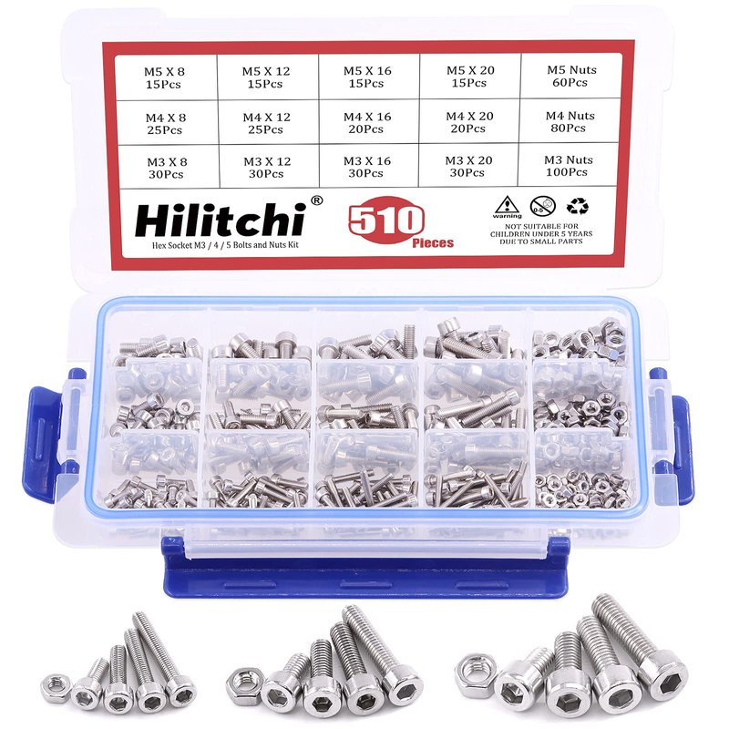 Hilitchi 510pcs M3 M4 M5 Stainless Steel Hex Socket Head Cap Bolts Screws Nuts Assortment Kit - 304 Stainless Steel (Hex Socket)