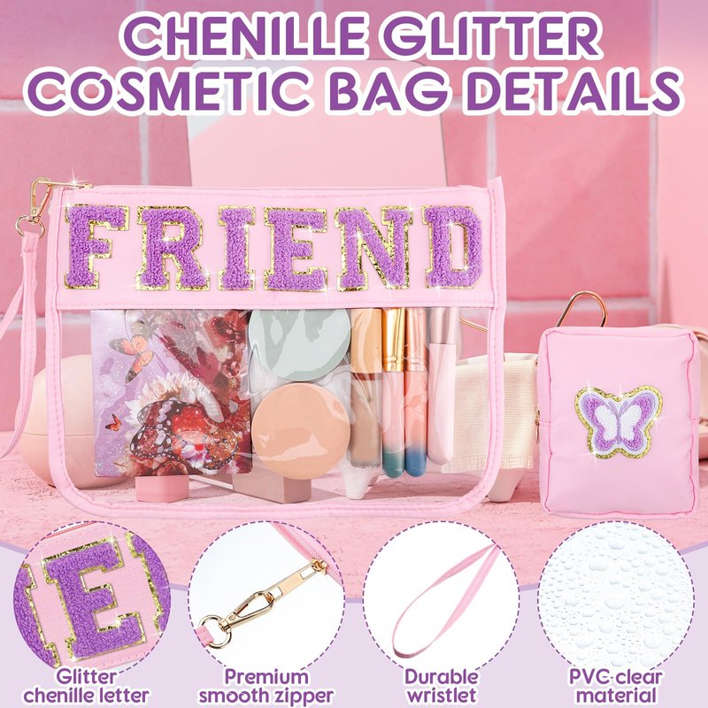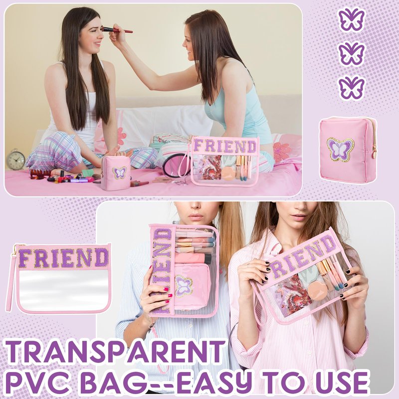- Chenille Letter Cosmetic Bag: there are 2 pieces of best friend bags with 2 different designs, large one is firmly embroidered with the letter patch [FRIEND] and golden glitter border, small one is designed with a butterfly patch, stylish and novel appearance is favored among female friend