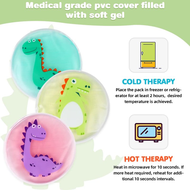 - 👍【Nature Soothing Kids Friendly】- This kids ice packs for boo boos are made of medical grade PVC and contain liquid gel, which can be stored in the refrigerator and used as daily first aid cold packs. These cute and handheld gel packs are a fun way to appease kids to feel better both physically and emotionally. They are flexible and comfortable to place on injury area. The cute dinosaur pattern are suitable for boys or girls.