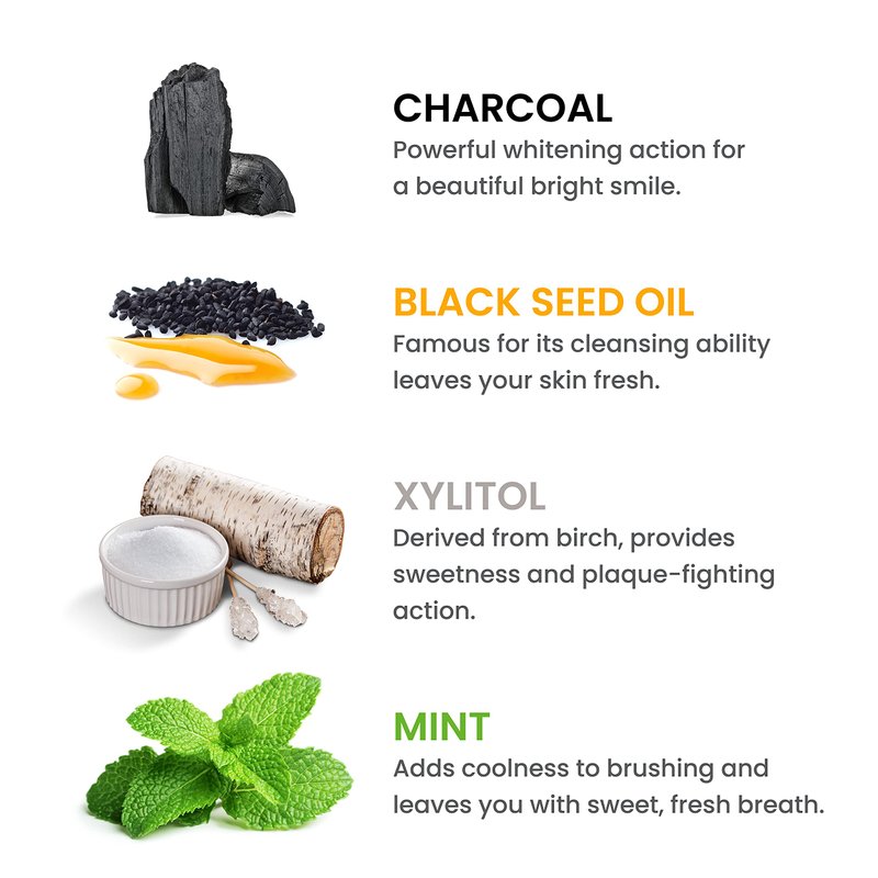 - UNIQUE CLEANING AND PLAQUE FIGHTING INGREDIENTS: Let the powerful whitening action of Charcoal from Coconut Shell powder and the famous cleansing ability of Black Seed Oil leave your mouth feeling fresher and your smile looking brighter.