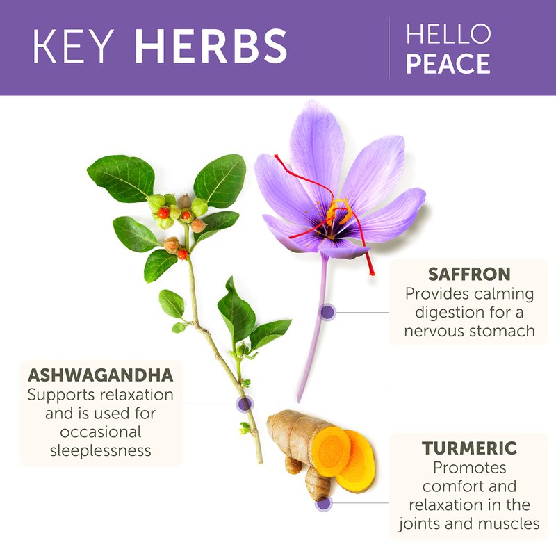 - Herbal Stress Relief Supplement: Himalaya Hello Peace is formulated with an herbal and botanical blend of Ayurvedic ingredients like Ashwagandha, Turmeric, Saffron and more to promote a balanced, grounded response to everyday stressors.*