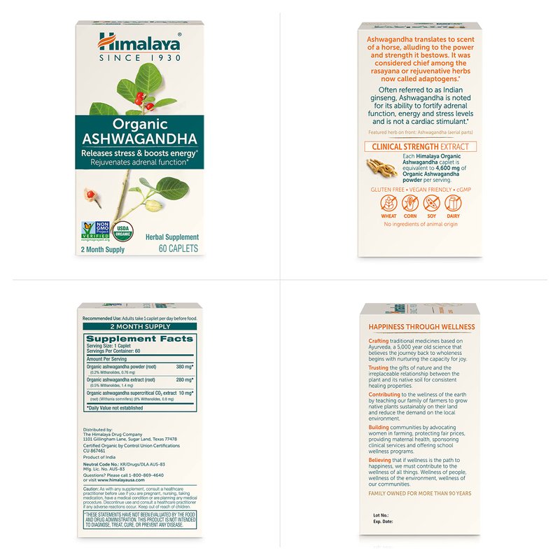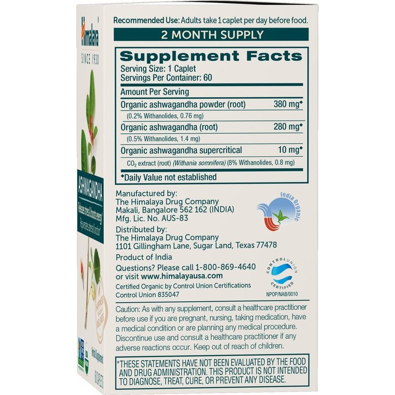 Himalaya Organic Ashwagandha, 120 Day Supply, Herbal Supplement for Stress Relief, Energy Support, Occasional Sleeplessness, USDA Organic, Non-GMO, Vegan, Gluten Free, 670 mg, 60 Caplets, 2 Pack
