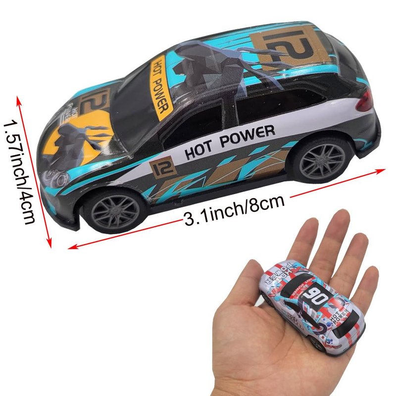 - PACAKAGE & DEMENSION:Package include 4pcs different colors die-cast racing cars and 3pcs mini traffic cones,color as random.3.1inch(length)x1.5inch(width),Perfect size for 3-6 toddlers , you can put cars in pant pockets and carry them around.