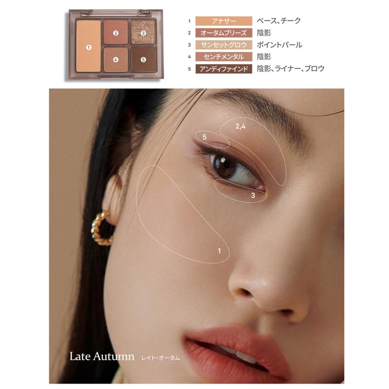 - LATE AUTUMN: Step into the rich hues of our LATE AUTUMN palette, where depth meets subtlety. Embrace bold yet nuanced shades that intensify your eyes with captivating depth, striking the perfect balance of boldness and elegance.