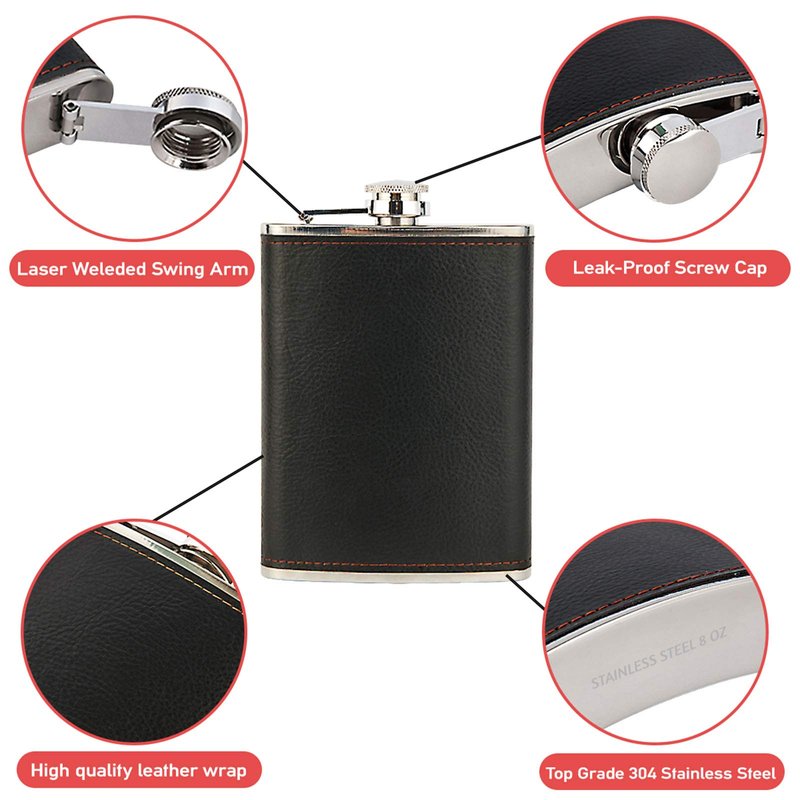 - 【ELEGANT LEATHER】Hip flasks for liquor is covered with premium black PU leather.This leather is easy to grab, store and hide in your suit, jeans pocket, jacket, fishing box, beach bag or travel bag.Even in the cold winter, you still feel warm with this leather flask for men.