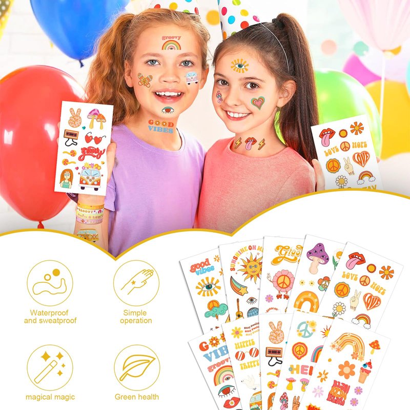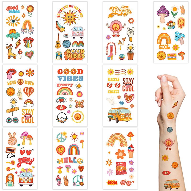 - Material:The hippie-themed party tattoo sticker is made of high-quality paper and covered with film, which is not easy to fade, durable and waterproof.Printed in vibrant colors and clear printing,can serve you for a long time.