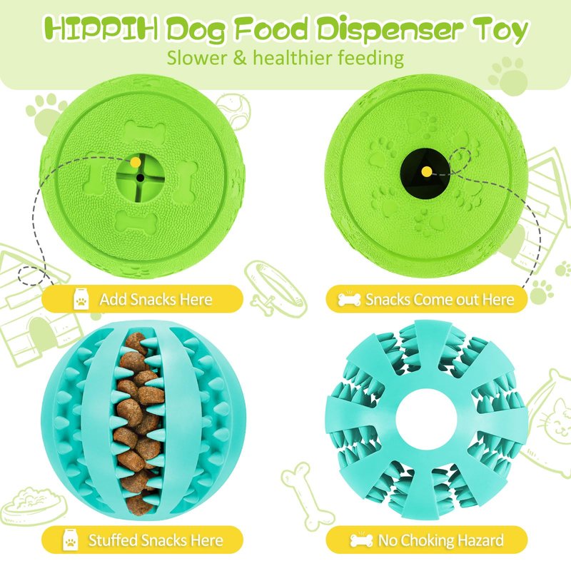 - RUBBER MATERIAL: HIPPIH treat dispensing dog ball is made of extra-tough rubber with good elasticity, good for your sweet dog grinding and fresh their teeth. ( Blue color-2.75 in, Green color-3.14 in, suitable for medium and large dogs. Not suitable for miniature small dogs, such as Yorkshire Maltese, etc) NOTE: The dog puzzle ball must be wider than your dog's mouth