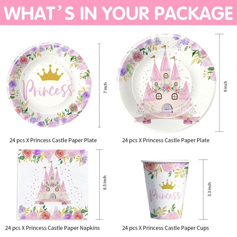 - 【What Will You Get】Our princess baby shower decorations dinnerware set included 24pcs 9'' castle dinner plates, 24pcs 7'' princess dessert plates, 24pcs paper napkins, and 24pcs paper cups, for princess theme birthday party decorations